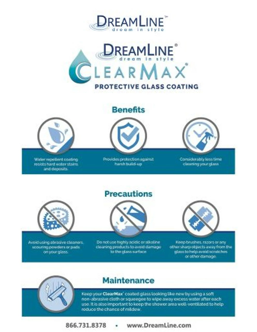 - DreamLine exclusive ClearMaxâ„¢ water repellant and stain resistant protective coating