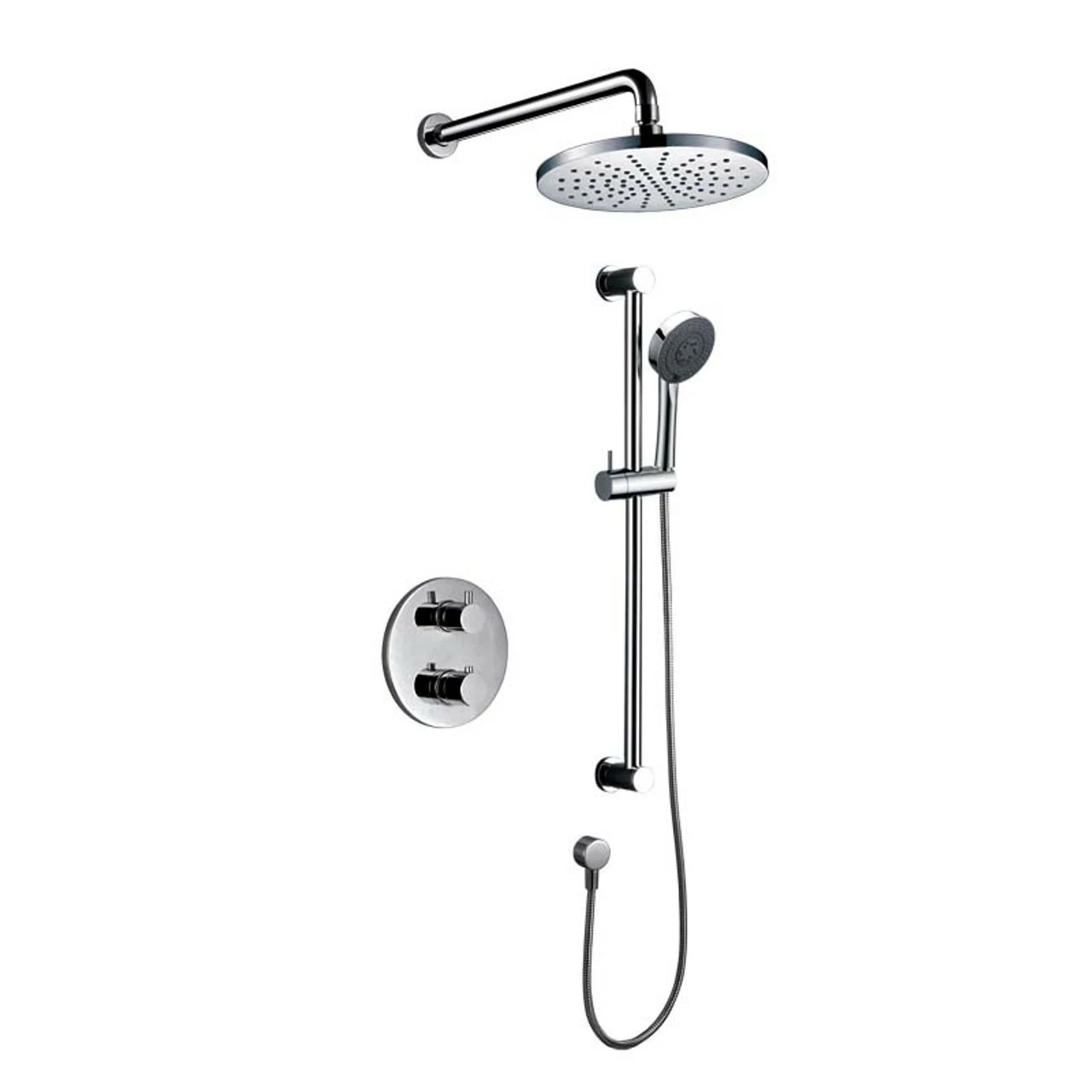 Constructed from brass, with modern ceramic disc technology, round handles with slim levers give you finger tip control of the temperature and flow of water to either the round fixed shower head or slide rail kit.