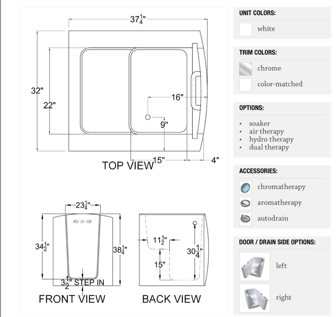 This walk-in bath tub is available in several variations such as with whirlpool jets only, air jets only, with a combination of both whirlpool and air jets (dual system), or as a soaker, with no jets at all. There is a 15” contoured seat to provide you with ultimate comfort. Sit down and immerse yourself in a relaxing atmosphere, while all your stress disappears. This walk in bath tub comes with adjustable feet for easy installation and leveling.