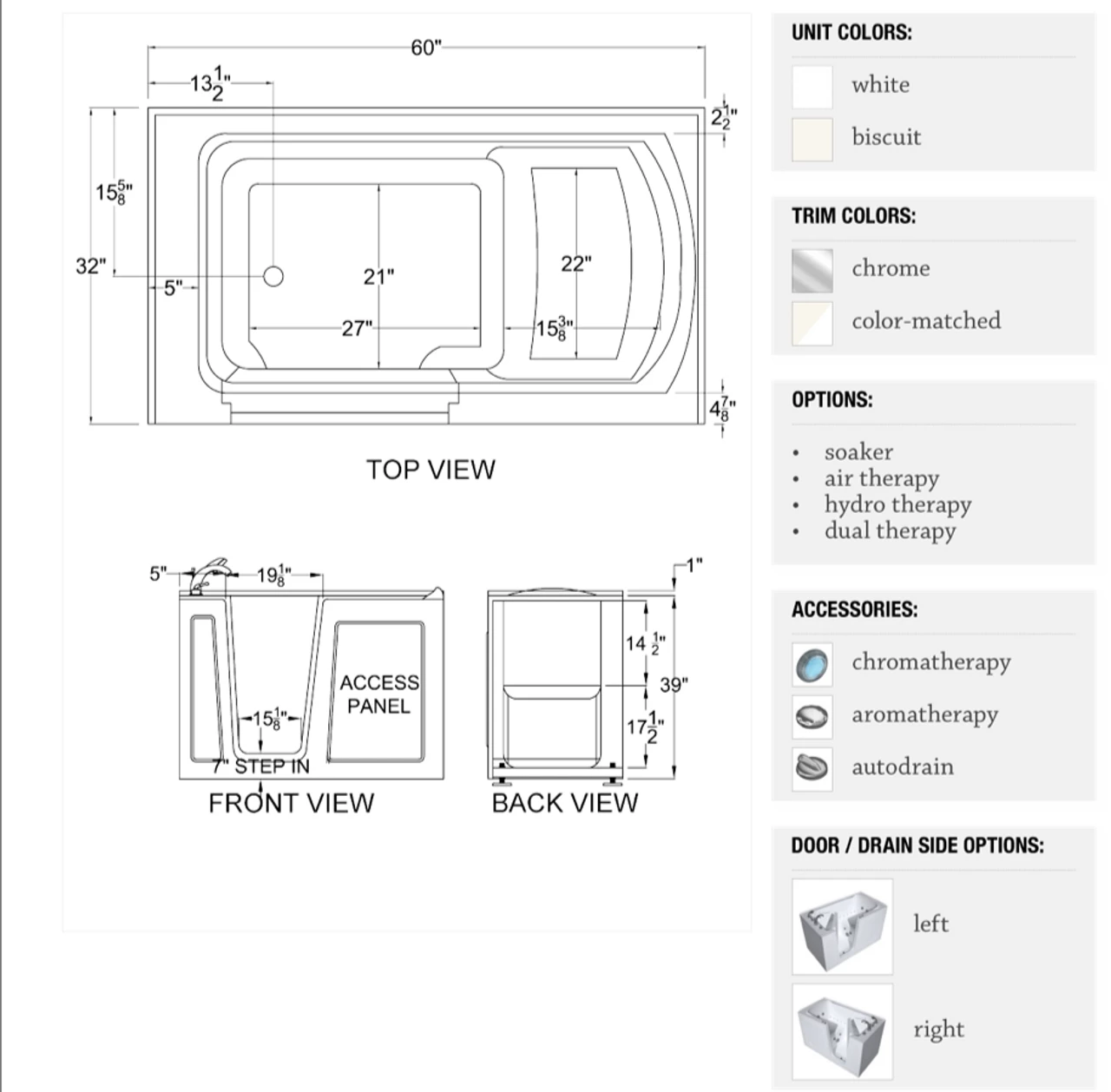 The Meditub 3260 is a uniquely designed reinforced fiberglass acrylic walk in tub with a side door. It allows for installation in small areas such as a shower stall, mobile home, closet or a laundry room. Enclosed on three sides, the free standing design allows you to enjoy the luxury of independent bathing anywhere you want! Just sit down and be embraced by the warmth and healing from your new tub from Meditubâ„¢.Â
